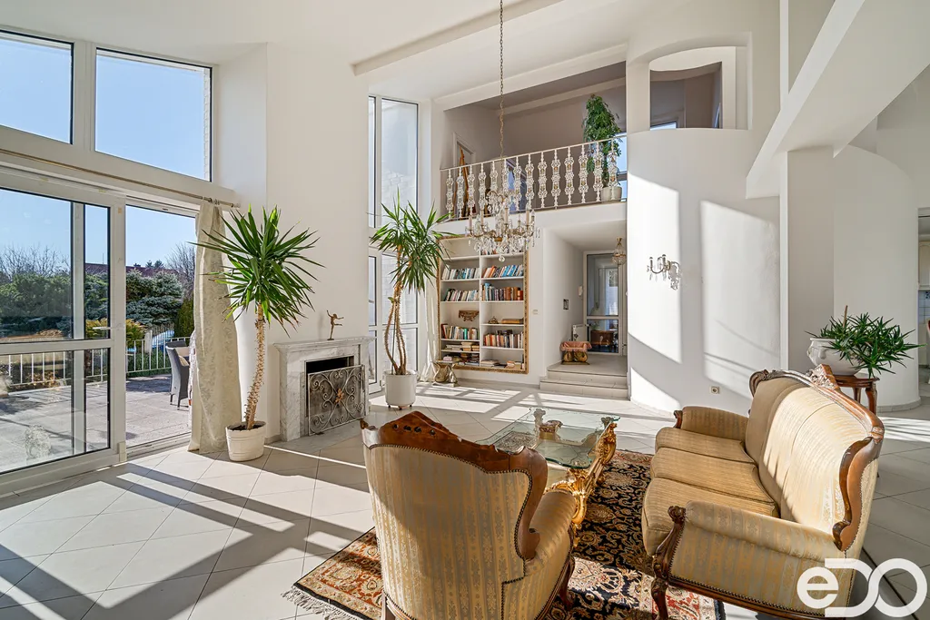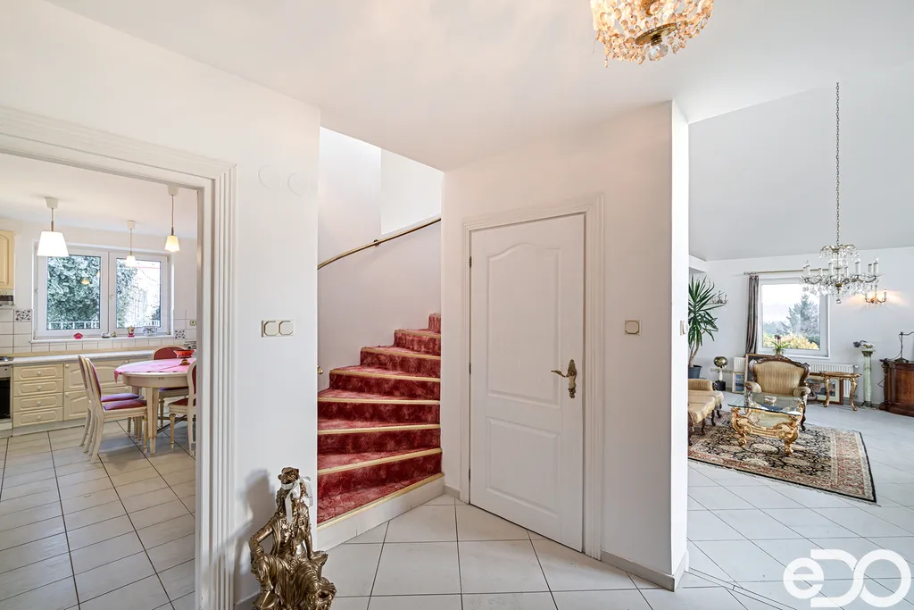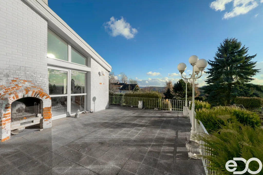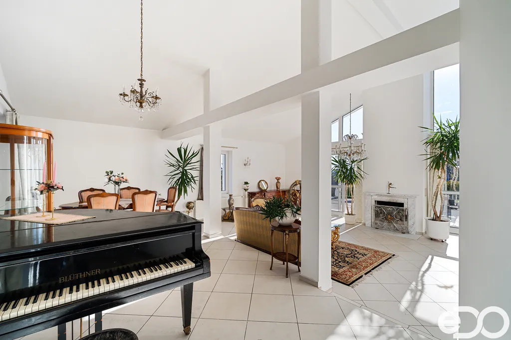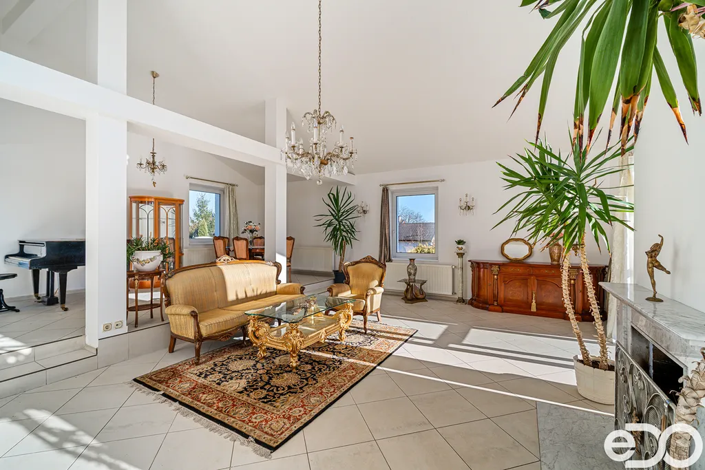 K dispozici je prostorná terasa s krbem, zimní zahrada a rozsáhlé technické zázemí v podzemním podlaží včetně dvojgaráže.