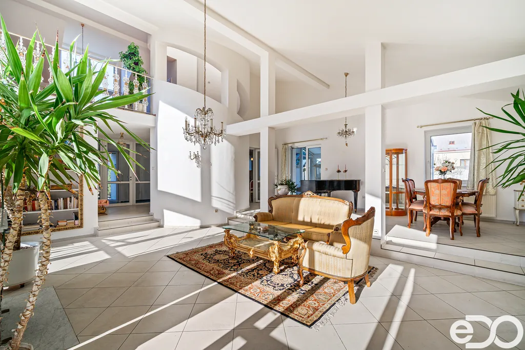 Dům je plně podsklepený a nabízí celkovou užitnou plochu cca 467 m². Kromě hlavního obytného prostoru disponuje také samostatnou jednotkou s vlastním vstupem a sociálním zázemím. Dominantou je centrální obytný prostor s otevřeným stropem a galerií, na kterou navazují dvě ložnice, každá s vlastní koupelnou.