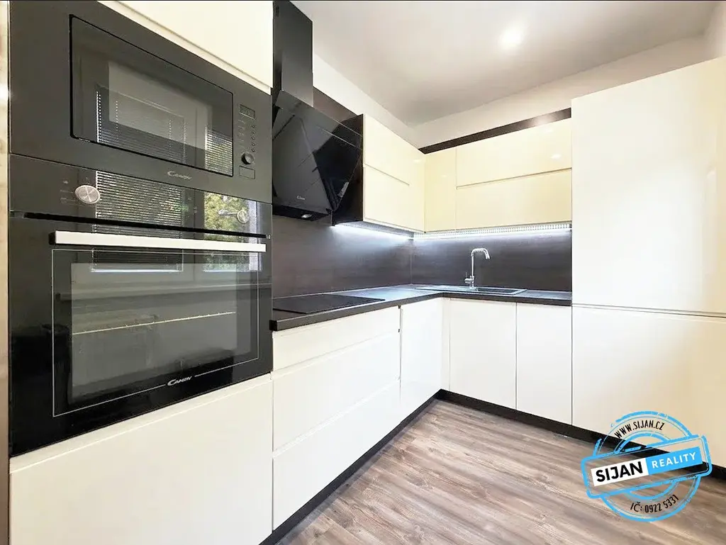 Dominantou bytu je moderní kuchyňská linka v elegantním designu, vybavená vestavnými spotřebiči – indukční varnou deskou, elektrickou troubou, myčkou, lednicí s mrazákem a kvalitním fragranitovým dřezem.