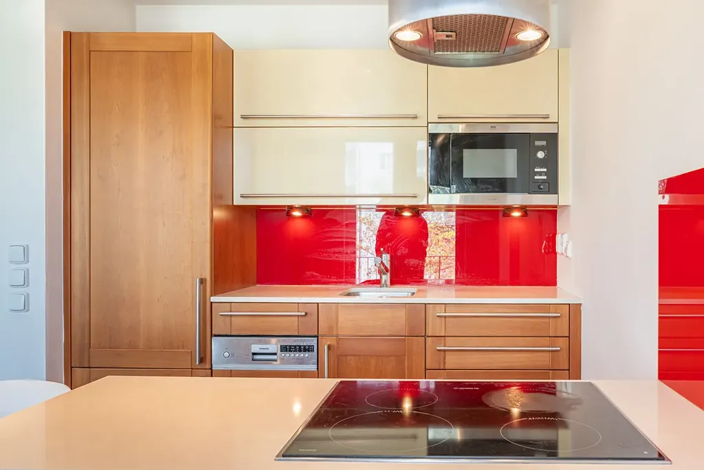 • Kuchyně pro náročné: Zakázková linka značky Hanák (masiv třešeň) vybavená prémiovými spotřebiči De Dietrich (pyrolytická trouba, indukční varná deska), myčkou a lednicí