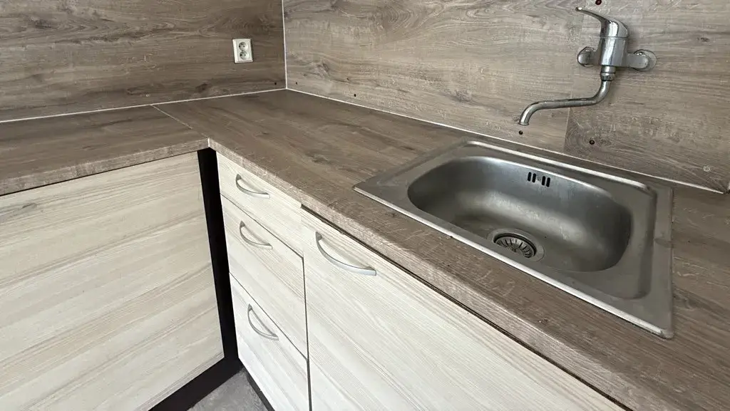 Vstupními dveřmi vejdeme do bytu a ocitneme se v předsíni o výměře cca 1,62 m2. Kuchyně o velikosti cca 12,10 m2 je vybavena kuchyňskou linkou, lednicí, mikrovlnnou troubou a sporákem. U kuchyňské linky je přívod na pračku. Součástí kuchyně je spíž s regálem, pro úschovu například suchých potravin, spíž má výměru cca 0,66 m2. Z kuchyně dále vejdeme do hlavní obytné části o výměře 17,00 m2. Jedná se o atypický a moc pěkný pokoj. Koupelna o výměře cca 3,50 m2 je spojená s WC. Její součástí je vana, umyvadlo, zrcadlo a plynový ohřívač na teplou vodu.