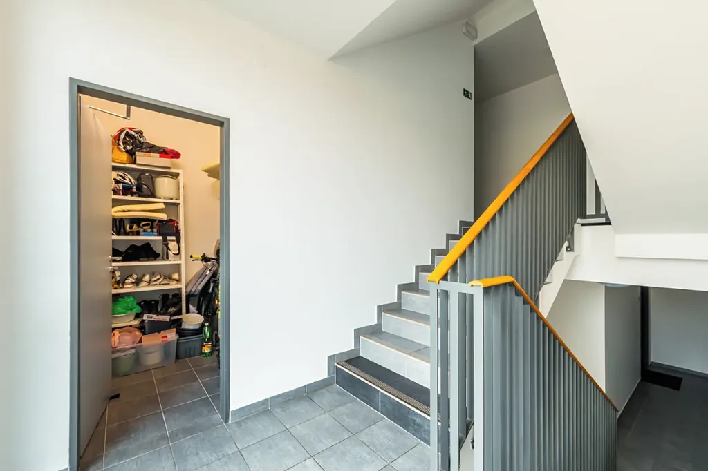 K bytu patří venkovní parkovací místo (za příplatek 1000 Kč/měsíc) a komora v mezipatře domu.