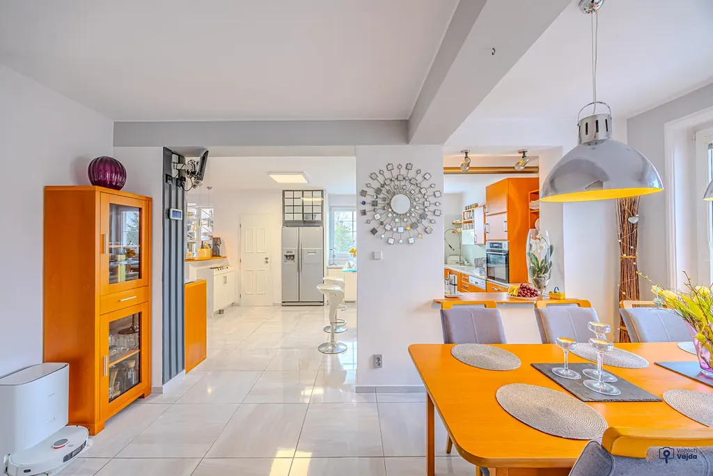 Interiér domu byl navržen s důrazem na kvalitu, prostor a funkčnost. O vytápění domu se stará tepelné čerpadlo značky Nibe, které zajištuje efektivní a úsporný provoz. V horkých letních dnech oceníte klimatizaci. Velkou přidanou hodnotou je instalovaná fotovoltaická elektrárna, díky které jsou měsíční náklady na energie prakticky nulové. Celkové roční náklady na elektřinu za rok 2025 byly 26 tis Kč a celkové příjmy díky smlouvě na fotovoltaickou el. byly 35 tis Kč. S ohřevem teplé vody pomáhají solární kolektory.