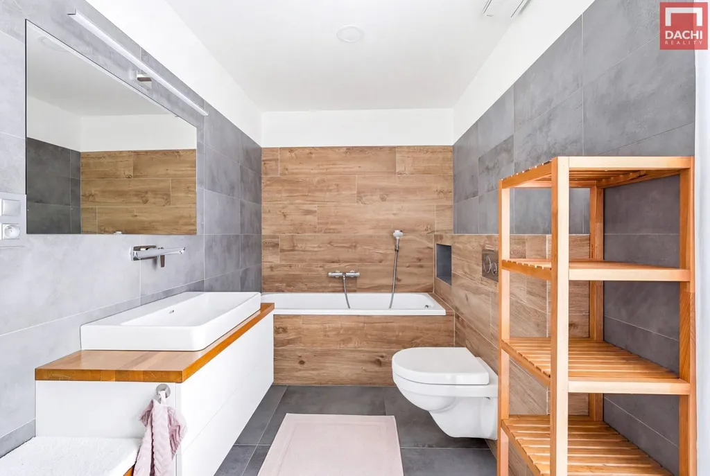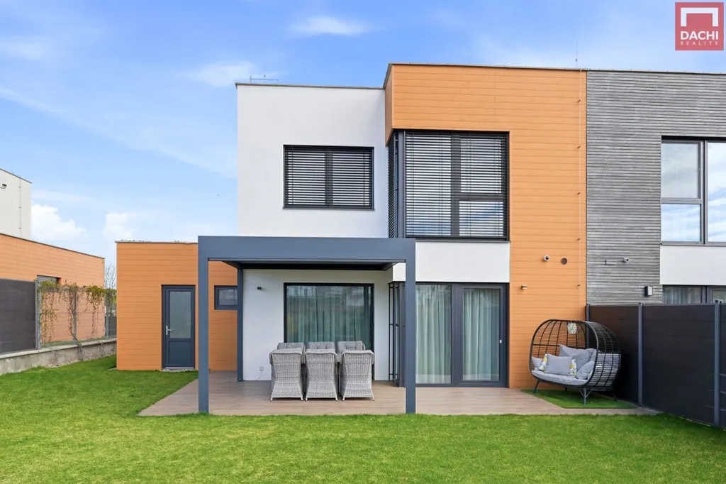 Dominantou domu je velkorysý obývací prostor propojený s kuchyní, který tvoří srdce celého domu. Díky západní orientaci je interiér krásně prosvětlený zejména v odpoledních hodinách a plynule navazuje na zahradu s vydlážděnou terasou. Ta je doplněna variabilní stínící pergolou a venkovními žaluziemi, které umožňují komfortní využití prostoru po celý den i rok. Zahrada je upravená tak, aby byla funkční a estetická ideální pro odpočinek i rodinné aktivity.