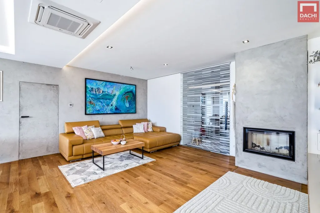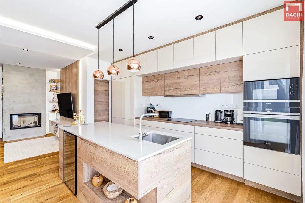 Kuchyň na míru je vybavena značkovými spotřebiči a dominuje jí velkorysý ostrůvek s vestavěnou vinotékou. Na kuchyň plynule navazuje prostorná potravinová spíž o velikosti 3,4 m. Obývací část pak příjemně dotváří krbová vložka.