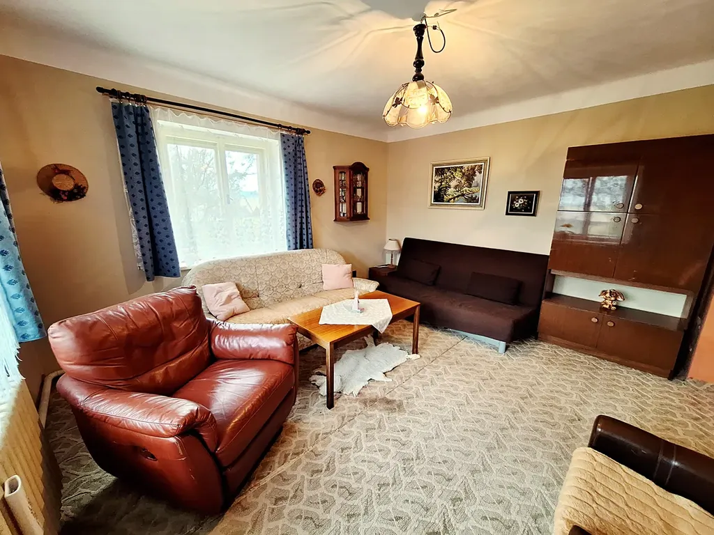 Prostorná zahrada před domem. Za domem druhá část zahrady s dílnou/kolnou. Vedle domu prostorná garáž, dostatečně velká i na dílnu. Do domu se vchází přes zápraží, v domě je vstupní chodba z té se vchází do dvou pokojů (žlutý průchozí a modrý). Z chodby se schody do podkroví se projde do kuchyně, která je průchozí do obývacího pokoje a do ložnice. V přízemí domu je ještě koupelna a špajz/spíž.