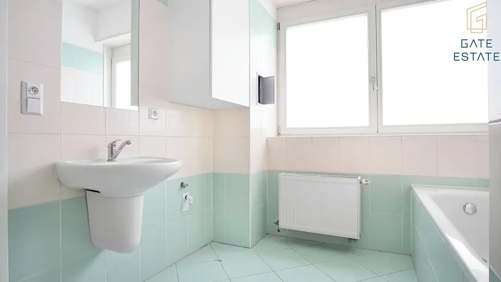 Koupelna disponuje vanou i sprchovým koutem, WC je samostatně.