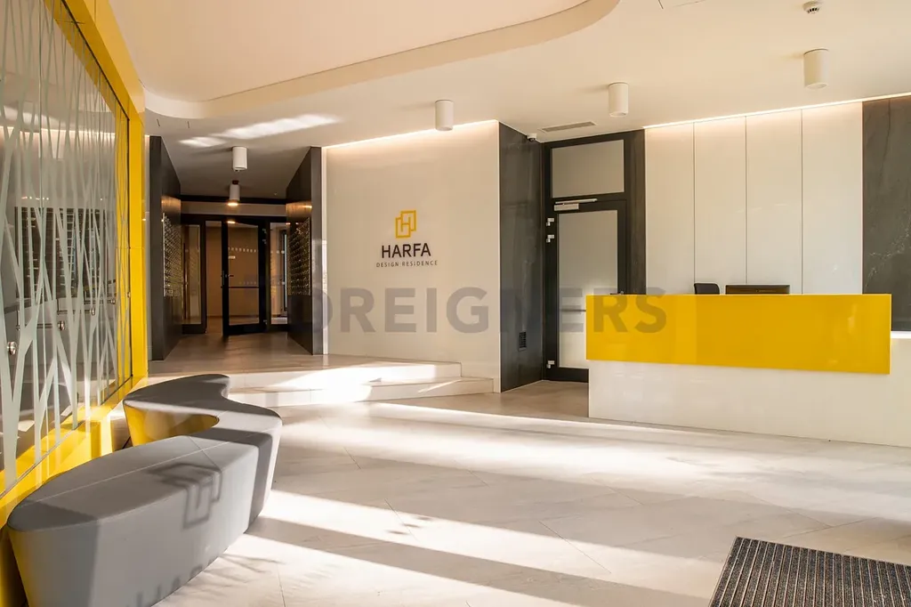 Harfa Design Residence Vás vítá s otevřenou náručí a nabízí luxusní interiéry s chromovými detaily a nezaměnitelné žluté prvky na fasádě.Recepce u hlavního vchodu zajišťuje vysokou úroveň služeb a bezpečí.