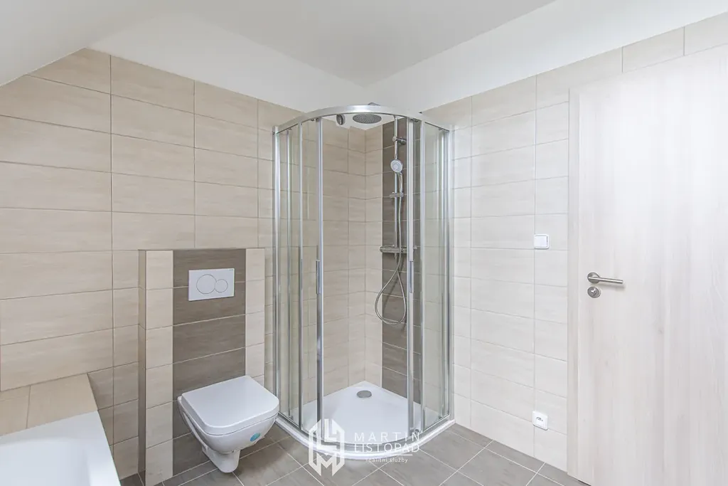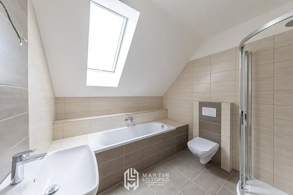 Rodinný dům je nízkoenergetická stavba v tradičním stylu, umístěním řešena jako dvojdomek se sedlovou střechou. Okna a vstupní dveře jsou plastová s trojskly. Dům je dispozičně řešen jako 5+kk o celkové užitné ploše 127 m2 + garáž pro dva automobily. V přízemí se nachází obývací pokoj s kuchyňským koutem, krytá terasa se vstupem do obývacího pokoje, pracovna, technická místnost se sprchovým koutem, umyvadlem a WC, zádveří, šatna a schodiště. V druhém nadzemním podlaží jsou situovány 2 pokoje, ložnice a prostorná koupelna se sprchovým koutem, vanou, umyvadlem a WC. Nemovitost má následující zařízení interiérů: kuchyňskou linku osazenou kvalitními vestavěnými spotřebiči (myčka, lednice s mrazákem, indukční sklokeramická deska, elektrická a mikrovlnná trouba, plovoucí podlahy kombinované s dlažbou, moderní zařizovací prvky koupelen, nadstandardní interiérové dveře vč. zárubní a vestavěné skříně v pokojích. Topení je teplovodní radiátorové v kombinaci s kondenzačním plynovým kotlem, v koupelně a technické místnosti jsou umístěny topné žebříky.