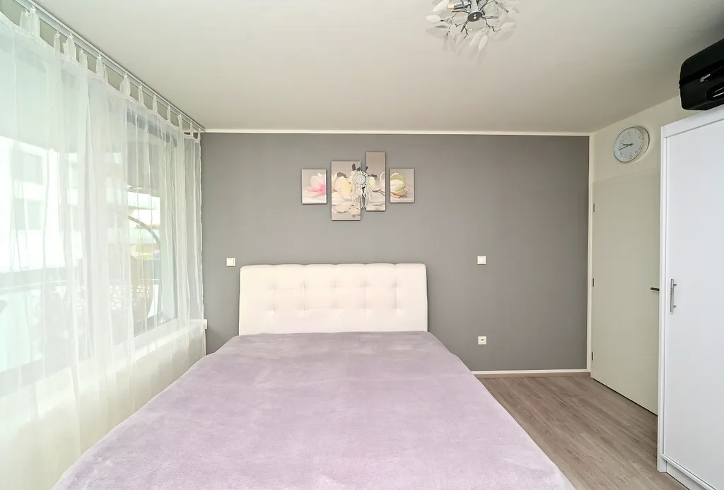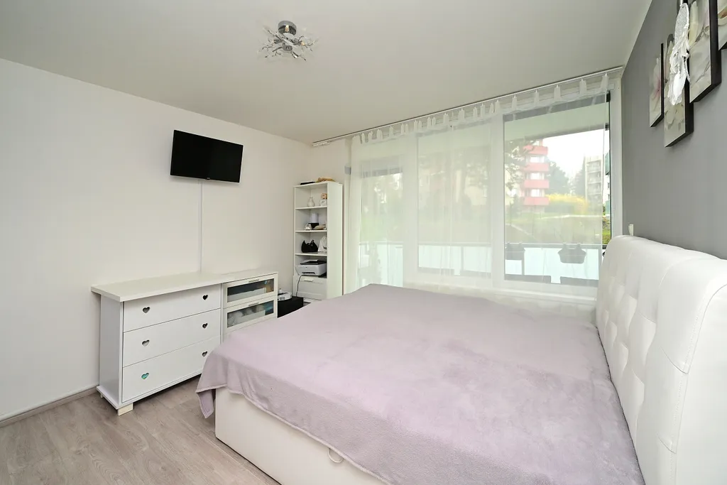 K bytu náleží velký balkon o ploše 10 m², které majitelé díky své velikosti užívají jak k posezení a příjemné relaxaci.