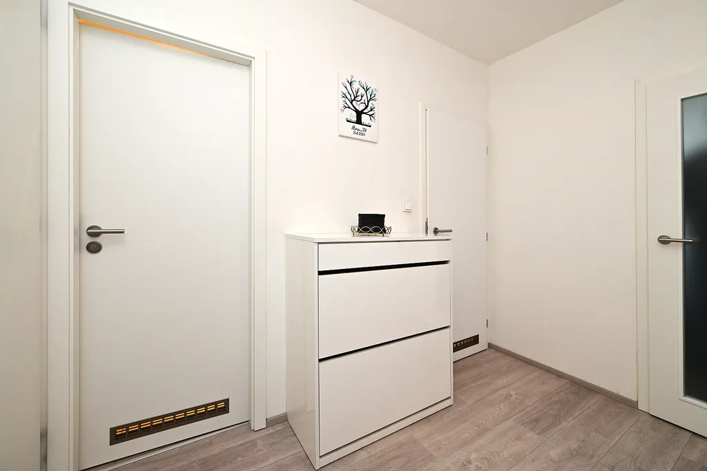 Jak kuchyňská linka, tak vestavěný nábytek na chodbě byl vyroben na zakázku, v obývacím pokoji pokoji je nainstalována klimatizace, která zajišťuje v letních dnes příjemné klima.