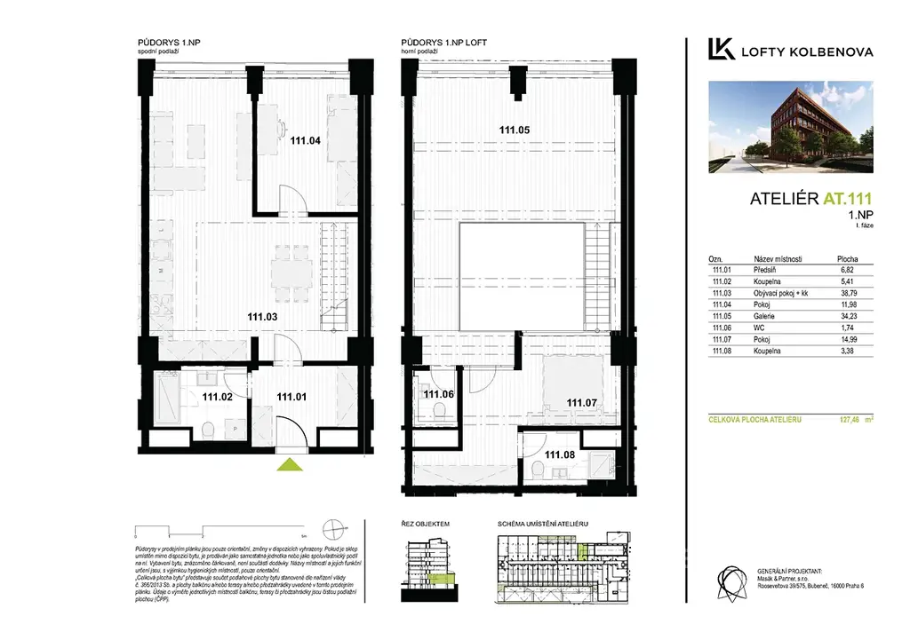 Jednotka se nachází v kompletně zrekonstruovaném industriálním objektu, který byl citlivě přeměněn na moderní rezidenční projekt Lofty Kolbenova. Byly zde zachovány typické prvky jako vysoké stropy, betonové konstrukce a velkoformátová tovární okna. Tento developerský projekt získal ocenění jako uznání za nejlepší stavbu využívající stávající objekt v bývalé průmyslové lokalitě.