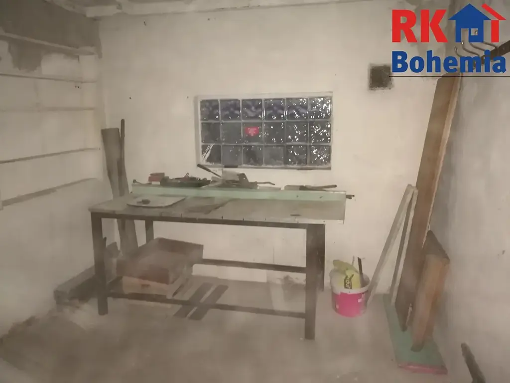 V garáže kovový regál a ponk, možné vyklidit.