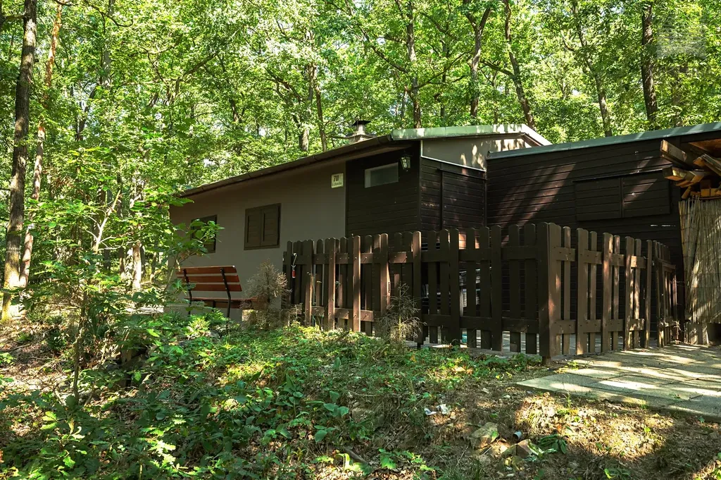 Interiér nabízí obývací pokoj s kuchyňským koutem, dvě samostatné ložnice a koupelnu. Chata je plně vybavena a připravena k okamžitému nastěhování. Součástí venkovního prostoru je příjemné zahradní sezení orientované do zeleně, které poskytuje klid, soukromí a ideální prostředí pro odpočinek na čerstvém vzduchu. K dispozici jsou také dvě parkovací místa přímo u chaty.