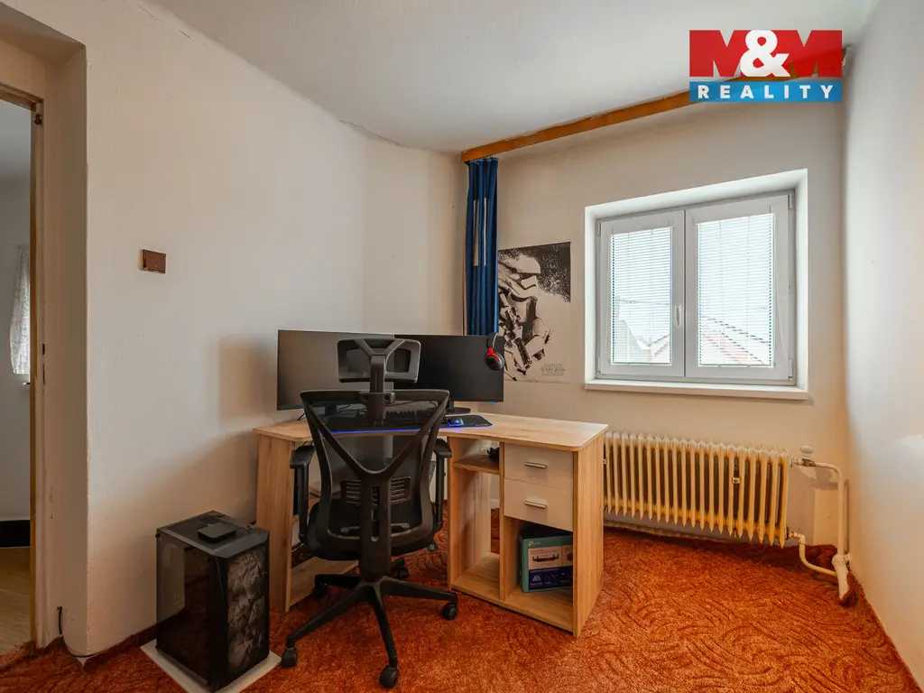 Nabízíme ke koupi tento rodinný dům dispozičně řešen jako 4+1 o velikosti 106 m² v klidné části městysu Divišov. Rodinný dům byl částečně rekonstruován: plastová okna, kondenzační plynový kotel a koupelna. Vstoupíte do nej dřevěnou verandou, na kterou navazuje chodba. Na levé straně nalezneme kuchyň a spíž a 1 pokoj, který nyní slouží jako ložnice. Naproti vstupu pak nalezneme koupelnu s vanou. Po pravé straně pak nalezneme samostatnou toaletu a schody do 2. poschodí. Tam se nachází 3 pokoje, které jsou průchozí, ale bude možné je propojit chodbou, která se vybízí vybudovat vedle místností. Pozemek nemovitosti tvoří předzahrádka a původní kůlna / dílna, která by s v budoucnu dala využít jako garáž. A co k Divišovu? Městys s výborným spojením na Prahu / 3 km Exit D1 / a Benešov s veškerou občanskou vybaveností. Krásný biotop, prima základní + mateřská škola. Více informací Vám ráda sdělím po telefonu.