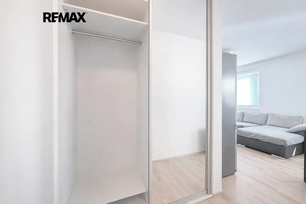 Dispozice je řešena velmi efektivně – obývací pokoj se zařízeným kuchyňským koutem a přímým vstupem na balkón, samostatná ložnice s přístupem do šatny, prostorná chodba a koupelna s vanou a otopným žebříkem. Velkým benefitem jsou úložné prostory řešené na míru, které dávají bytu nadstandardní funkčnost pro každodenní život. Díky orientaci na více světových stran (jih, východ, západ) je byt přirozeně světlý a vzdušný po celý den.