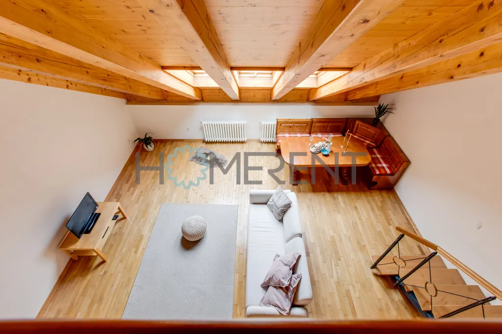 Dominantou bytu je velký otevřený obytný prostor s kuchyní, schodištěm, krbem a velkými okny, která zajišťují dostatek denního světla a dodávají interiéru vzdušnost a osobitý charakter. Prostor působí velmi příjemně, elegantně a zároveň útulně. Kuchyň je plně vybavená a připravená k okamžitému používání, takže poskytuje plnohodnotné zázemí pro každodenní život i příjemné posezení.