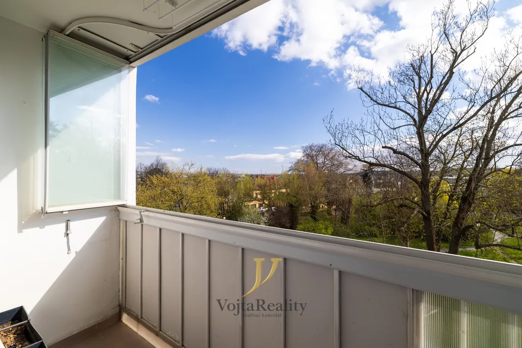 K bytu náleží zasklená lodžie a sklepní kóje (2 m²) zabezpečená ocelovou mříží.