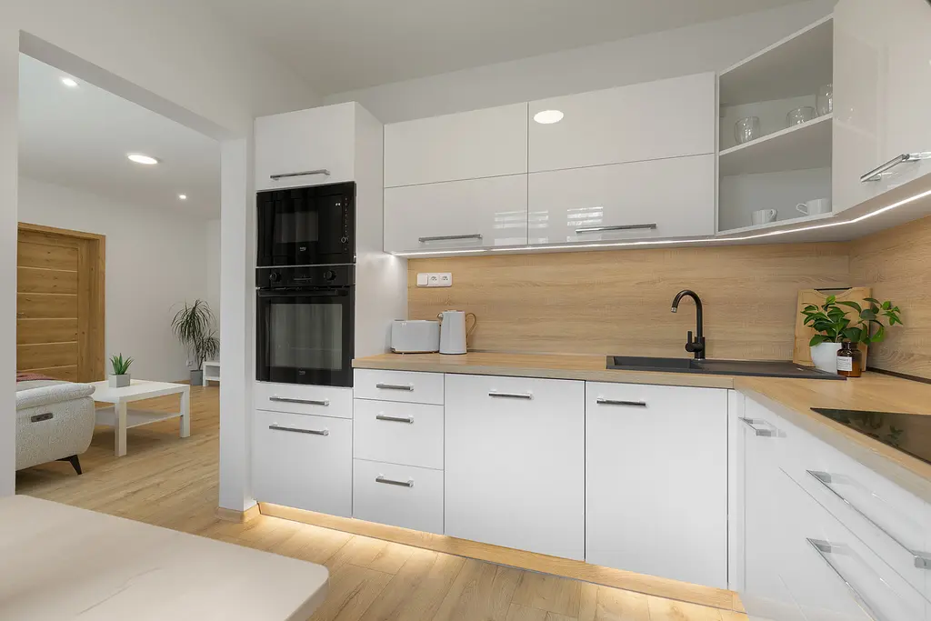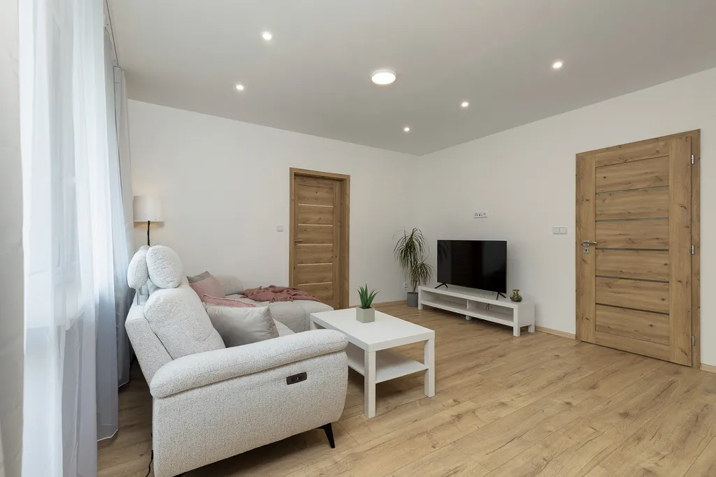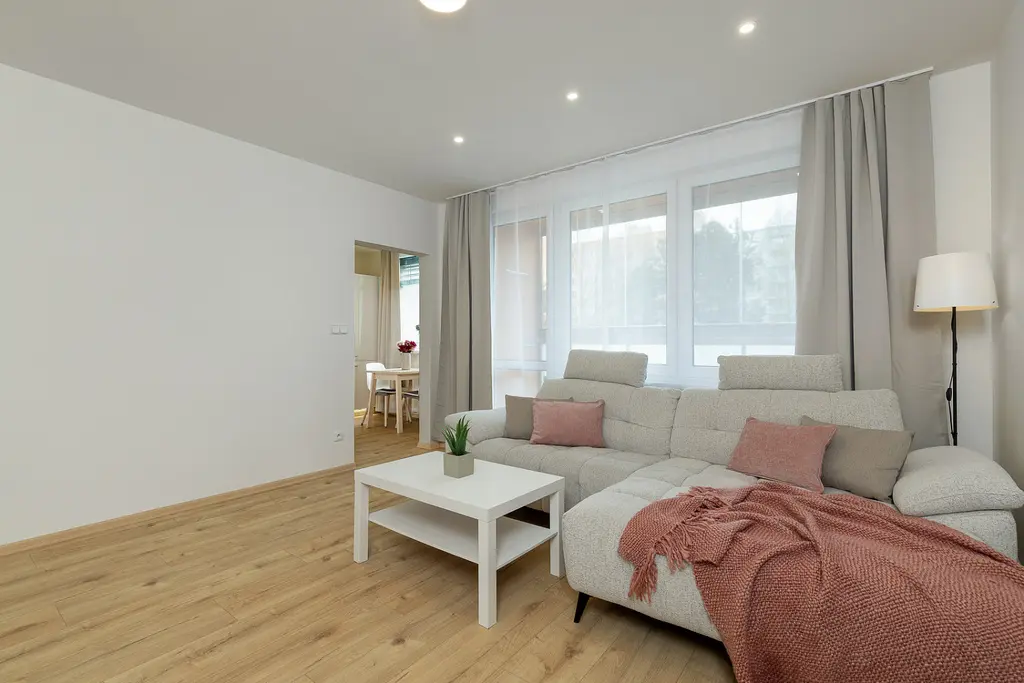 Bytová jednotka prošla v roce 2025 kompletní rekonstrukcí a nabízí moderní, čisté a praktické bydlení bez nutnosti dalších investic. Dispozice tvoří vstupní chodba s prostornými vestavěnými skříněmi, nadstandardně řešená koupelna s dostatkem místa pro pračku i sušičku, dále obývací prostor propojený s kuchyní vybavenou veškerými spotřebiči, samostatná ložnice a pracovna, která může sloužit také jako dětský pokoj nebo pokoj pro hosty.