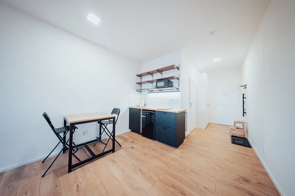 Byt je situován v 1. patře dvoupodlažního víceúčelového domu bez výtahu a je okamžitě volný k nastěhování. Bytová jednotka se sestává z prostorného pokoje s kuchyňskou linkou a koupelny se sprchovým koutem. Kuchyňská linka je vybavena elektrickým indukčním dvouplotýnkovým vařičem, dřezem a mikrovlnnou troubou. Pod linkou je potom samostatně stojící lednice. Byt je částečně vybaven nábytkem, což novým nájemníkům umožňuje snadnější nastěhování (viz. foto). Na chodbě je sdílená pračka a sušička pro volné využití.