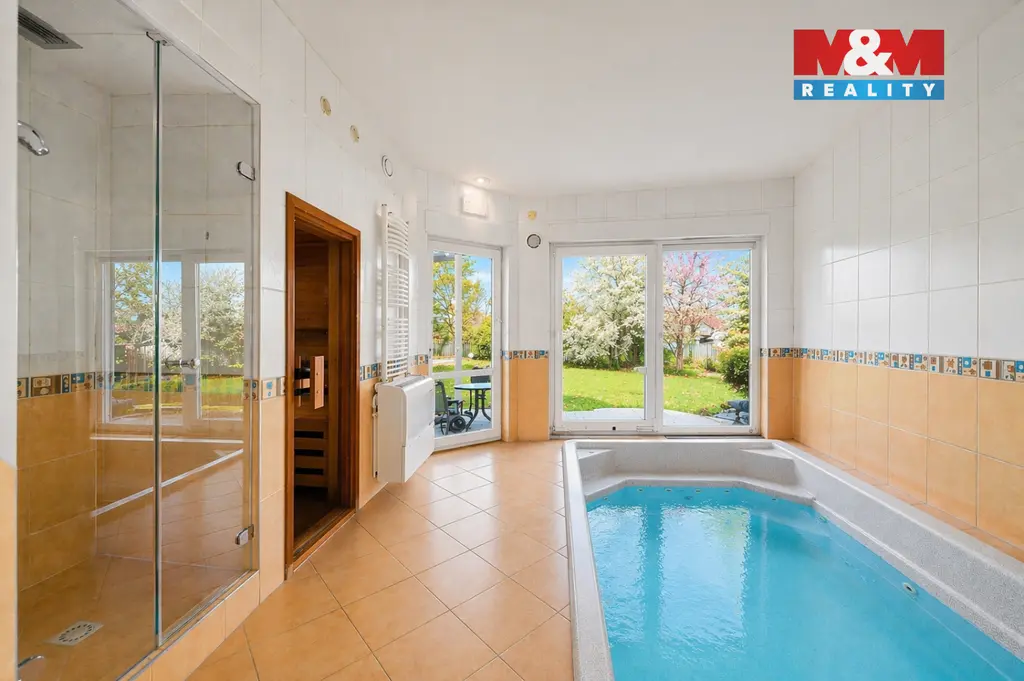 Součástí domu je i wellness zázemí – vnitřní bazén a sauna pro celoroční relaxaci. Komfort bydlení doplňuje rekuperace a praktická dvojgaráž.