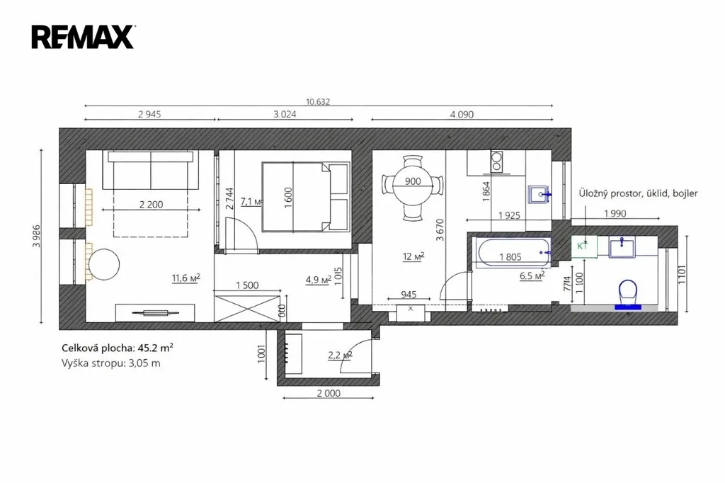 Byt se nachází ve 2. patře (3. NP) a jeho hlavní předností jsou vysoké stropy 3,05 m,