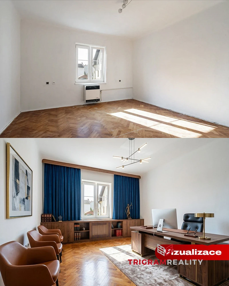 Dispozice nabízí vstupní chodbu, komoru, samostatnou toaletu, dvě samostatné místnosti orientované do ulice a kuchyň, ze které je vstup do prostorné koupelny. Dispoziční řešení umožňuje vytvořit prostor pro vstup s recepcí a další dvě samostatné kanceláře, což nabízí využití zejména pro advokátní či účetní služby, ordinace, kosmetické služby a další podnikání vyžadující klidné zázemí v dobře dostupné lokalitě.