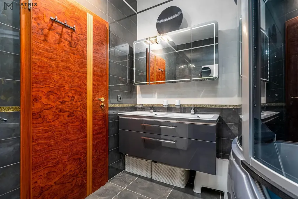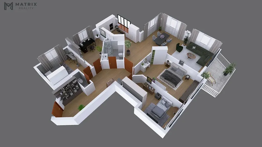 Jednou z hlavních předností bytu je jeho praktické dispoziční řešení. Celý byt se nachází na jednom podlaží, nejde tedy o mezonet, což přináší výrazně pohodlnější každodenní fungování pro rodinu, děti i starší členy domácnosti. Dispozice nabízí velkorysý obývací pokoj s jídelnou, samostatnou kuchyň, 3 ložnice, pracovnu, 2 koupelny s WC a dostatek úložných prostor.