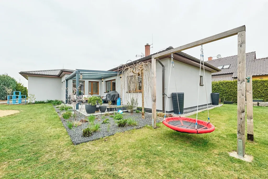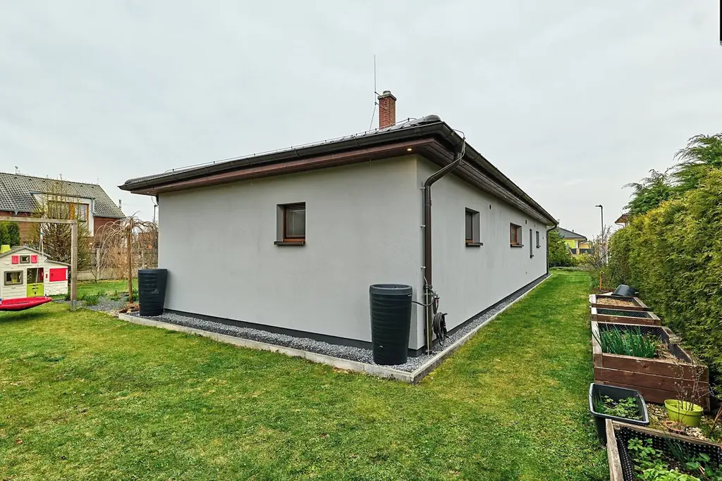 Prostorný dům stojí na skvělé adrese kousek od okraje Prahy ve směru na Brandýs nad Labem. Klidná obec, jejíž historie sahá až do 13. století nabízí skvělou dostupnost do hlavního města. Během několika minut dojedete na nájezdy dvou dálnic - první ve směru na Hradec Králové a druhou směrem na Mladou Boleslav. Samotný dům, jehož dispozici vidíte na půdorysu je dispozičně řešen jako 3KK a nabídne prostornou garáž. Rozlehlý obývací pokoj s kuchyní vybavenou vestavnými spotřebiči doplňuje světlý výklenek, ve kterém je situován jídelní stůl a vcházíme z něho na velkou terasu. Tento výklenek (zimní zahradu), lze případně zcela oddělit a vytvořit tak další samostatnou místnost. Terasa je vybavena moderním hliníkovým zastřešením, které je vybaveno dálkovým ovládáním, jímž lze stáhnout boční stěnu a dále stínění, aby vám zde bylo příjemně i v horkých letních dnech. Dům je obklopen akorát velkou udržovanou zahradou, která disponuje zahradním domkem, houpačkou pro děti a vyvýšenými záhony. Komfortní vjezd na pozemek zajišťuje brána s ovladačem, elektrická vrata do garáže jsou samozřejmostí. Komfort zajišťují dvě koupelny, z nichž 1. disponuje sprchovým koutem a WC a druhá pak vanou a WC. Vytápění zajišťuje tepelné čerpadlo v kombinaci s podlahovým topením.
