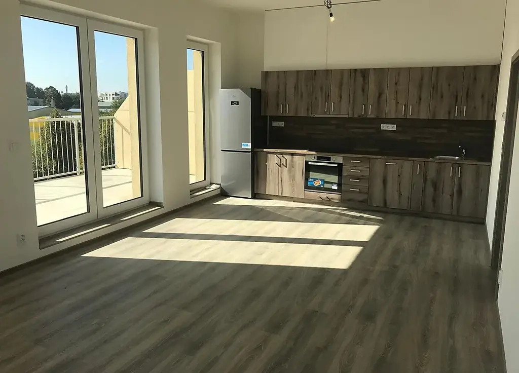 Nabízí pronájem nového terasového bytu 3+kk (A505) v nejvyšším patře s garážovým stáním šířky 3,5m a sklepem (8m2) na ulici Frištenského, Olomouc. Plocha jednotky 81m2 + plocha terasy 62m2. V každém pokoji je klimatizace. Dispozičně je byt moderně řešen - kuchyňský kout dohromady s obývacím pokojem, z obývacího pokoje přístup francouzskými okny na terasu, z chodby přístup do obývacího pokoje, ložnice, dalšího pokoje, šatny, koupelny a samostatného wc (zrcadlová skříňka, vana, umyvadlo, baterie, příprava na pračku). Vybavení bytu - kuchyňská linka se spotřebiči (varná deska 4 plotýnky, trouba, myčka, lednice s mrazákem, digestoř, dřez, baterie). Podlahy: v pokoji plovoucí podlaha, v koupelně a na wc dlažba. Plastová okna s vnitřními žaluziemi, podlahové topení. Kamerový systém hlavního vchodu. V blízkosti bytového domu se nachází tramvajová zastávka "Nová Ulice", autobusová zastávka "Tabulový vrch", mateřské školy (ul. Čajkovského, Jílová), základní školy (ul. Čajkovského, Stupkova), zdravotnické zařízení (Fakultní nemocnice Olomouc) a další.