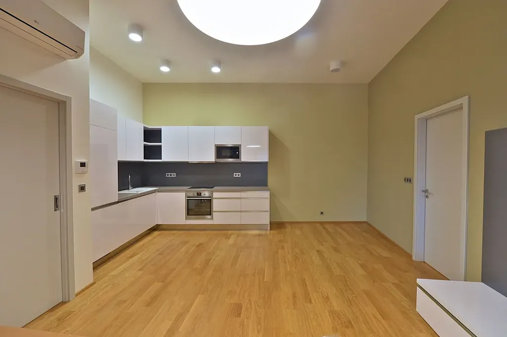 Velká okna, dřevěné podlahy, vestavěné skříně, klimatizace, satelitní TV, internet, video telefon, mikrovlnná trouba, myčka, pračka. Kamerový a zabezpečovací systém v budově. Parkování možné v podzemní garáži v domě. Možno pronajmout zařízený za vyšší nájemné.