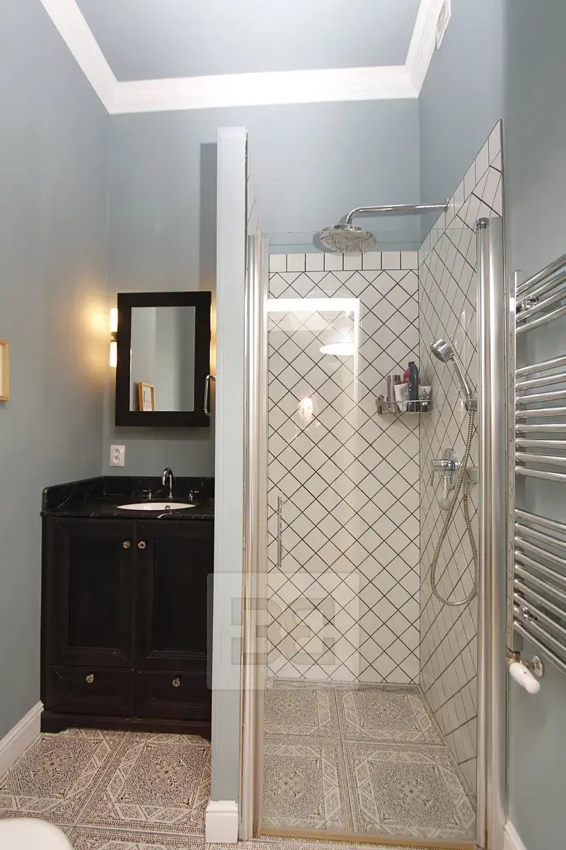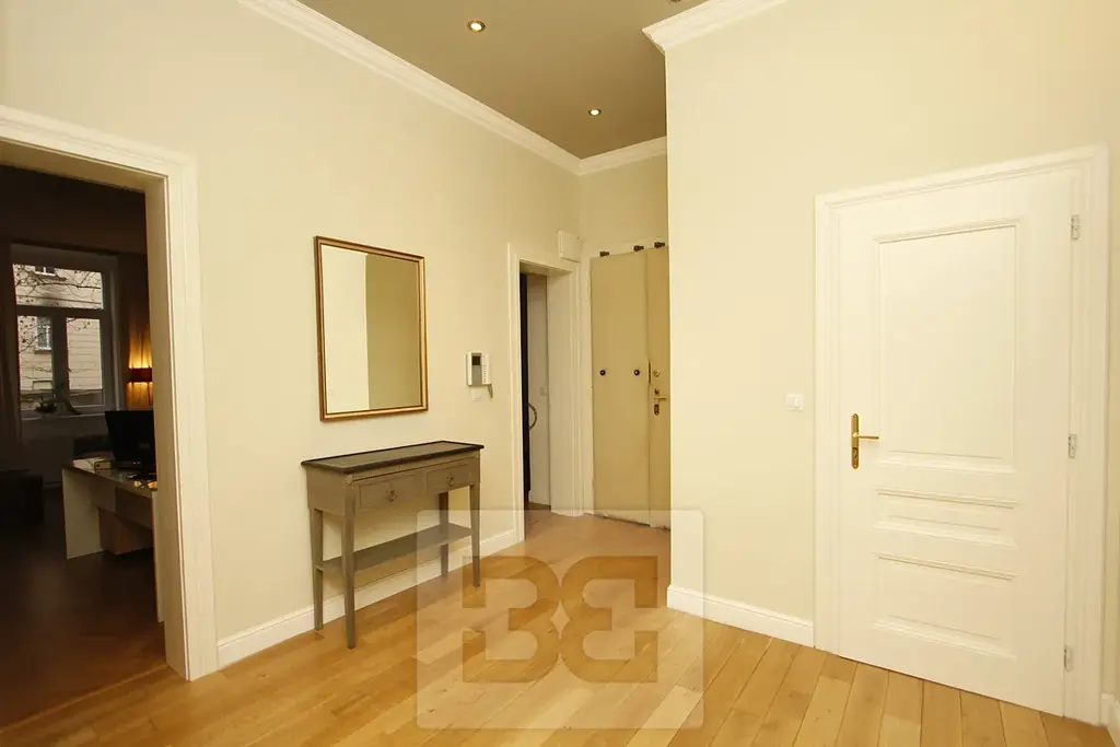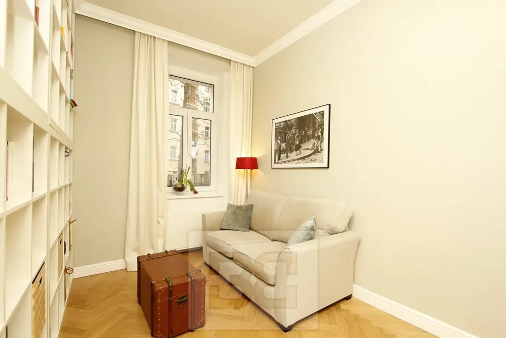 Dispozice: prostorný, jižně orientovaný obývací pokoj s kuchyňským koutem a balkonem, 3 pokoje orientované do tichého, zeleného vnitrobloku vč. ložnice s šatnou a ensuite koupelnou se stylovou volně stojící vanou, další 2 koupelny se sprchovým koutem + samostatné WC, pracovna, dětský pokoj, centrální vstupní hala, prostorná komora a technická místnost s pračkou. Kuchyňská linka s keramickým dřezem je vybavena všemi spotřebiči (lednice, myčka, plynová varná deska, el. trouba). Součástí vybavení je také skříň a knihovna v obývacím pokoji, šatní skříň a sofa v dětském pokoji a knihovna v pracovně.