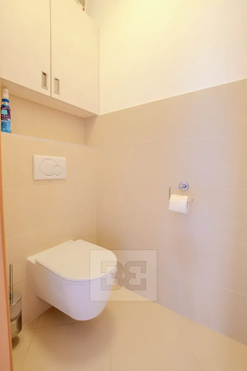 Byt má dvě samostatné ložnice, umístěné na opačných stranách bytu, což zajišťuje maximální soukromí. Hlavní ložnice je vybavena manželskou postelí a vestavěnou šatní skříní. Druhá ložnice je zařízena šatní skříní a pracovním stolem se židlí. Koupelna je prostorná a nabízí dvě umyvadla, vanu a pračku. Toaleta je samostatná. V předsíni se nachází vestavěná skříň a praktická komora, kterou lze využít jako šatnu nebo úložný prostor.