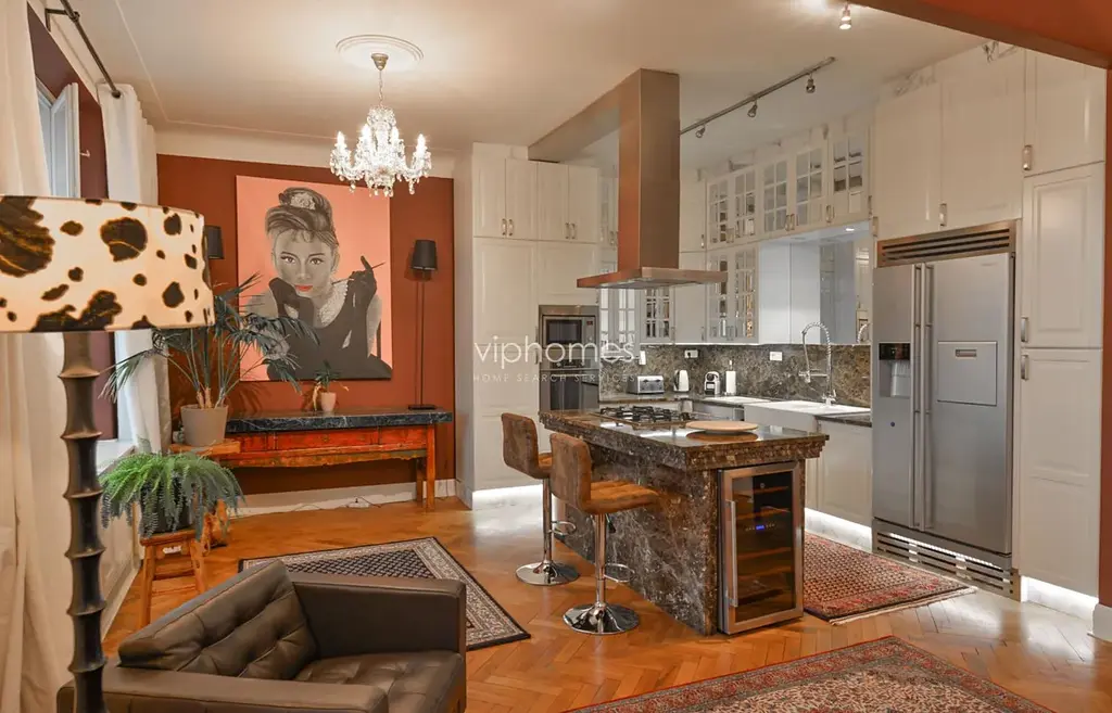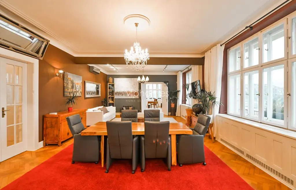 Společenské zázemí bytu tvoří dva průchozí obývací pokoje členěné na několik komfortních zákoutí. Součástí bytu je dále plně vybavená kuchyň s jídelnou, pracovna, ložnice s koupelnou, druhá koupelna a šatna. Balkon 2 m2 do klidného vnitrobloku. Interiér bytu okouzlí nadčasovou elegancí designu, pozornost přitahují kvalitní materiály, koberce, obrazy. Parketové podlahy, mramorové koupelny, alarm. Poplatky za domovní služby 6000 Kč / měs. Energie (15 000 CZK) budou převedeny na nájemce, případně platba zálohově 15 000 Kč / měsíc. Parkování v modré zóně.