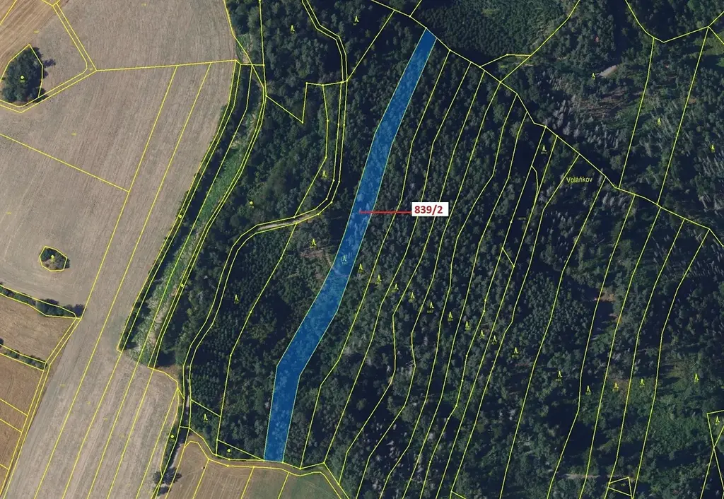Lesní pozemek o výměře 5465 m2, parcelní číslo 839/2, podíl 1/1, katastrální území Žďárec, obec Žďárec, obec s rozšířenou působností Tišnov, okres Brno-venkov, Jihomoravský kraj.