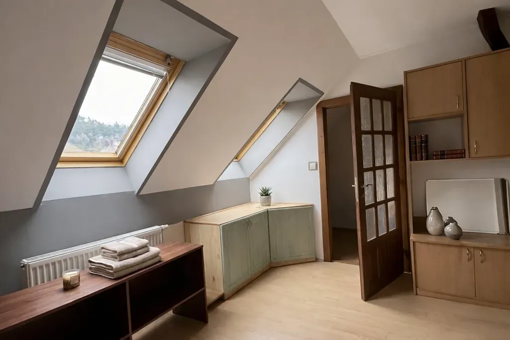 V první úrovni bytu se nachází předsíň, obývací pokoj plynule propojený s ložnicí, prostorná kuchyně s novou linkou a moderně řešená koupelna, která disponuje vanou i sprchovým koutem. Celkový dohled na detail podtrhují vkusné dekorativní obklady a nově realizované povrchy stěn a podlah.