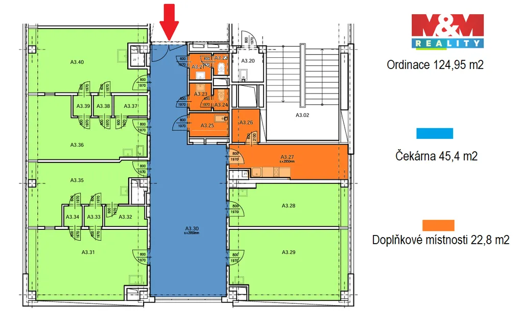 Uvedená cena je za celý celek a zahrnuje ordinace, čekárnu, doplňkové místnosti i podíl na společných prostorech. Nezahrnuje energie a provizi RK.