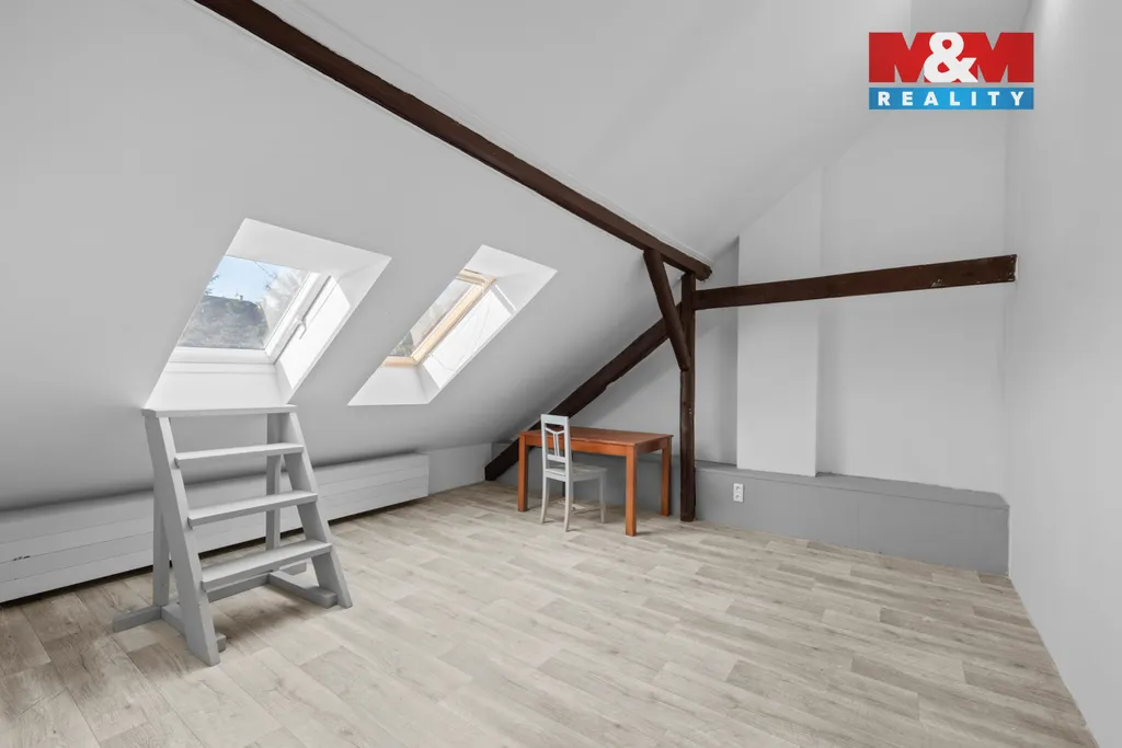 K pronájmu nabízíme prostorný a světlý byt v podkrovní mansardě o dispozici 2+1, situovaný v ulici Chržínská ve Velvarech.