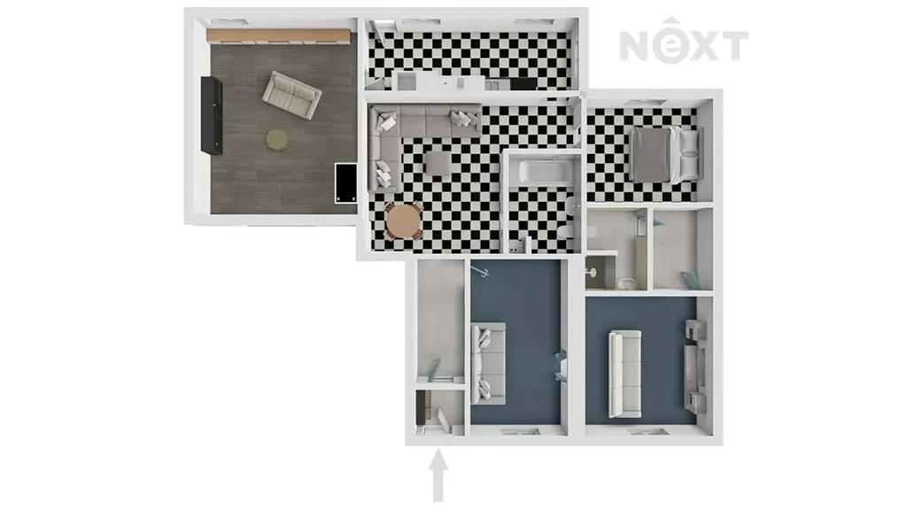 * druhá bytová jednotka 2+1: obývací pokoj (20,5 m2), koupelna s WC (5,7 m2), ložnice (11,8 m2), kuchyně (12,8 m2) Dále je k dispozici společná předsíň a chodba (8 m2), garáž (28,9 m2) a sklep.