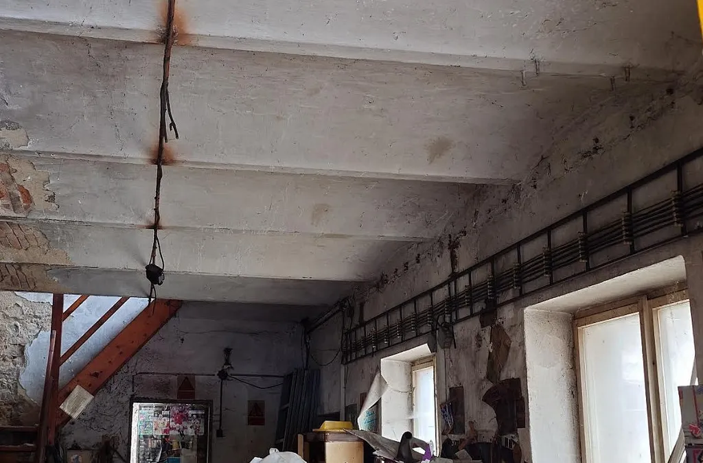 Vnitřní dispozice je rozdělena na jednu velkou místnost v prvním patře cca 40m² s vysokými klenutými stropy cca 3,4 m, ve druhém patře se nachází dvě místnosti o velikosti cca 17m² a 22m², výška 2,5m. Obě patra spojuje bytelné dřevěné schodiště. Široká vstupní vrata cca 220 x 190 je možno ještě zvětšit.. Pod střechou lze využít ještě úložný prostor. Parkování před vraty, nebo na bezplatném obecním parkovišti naproti.