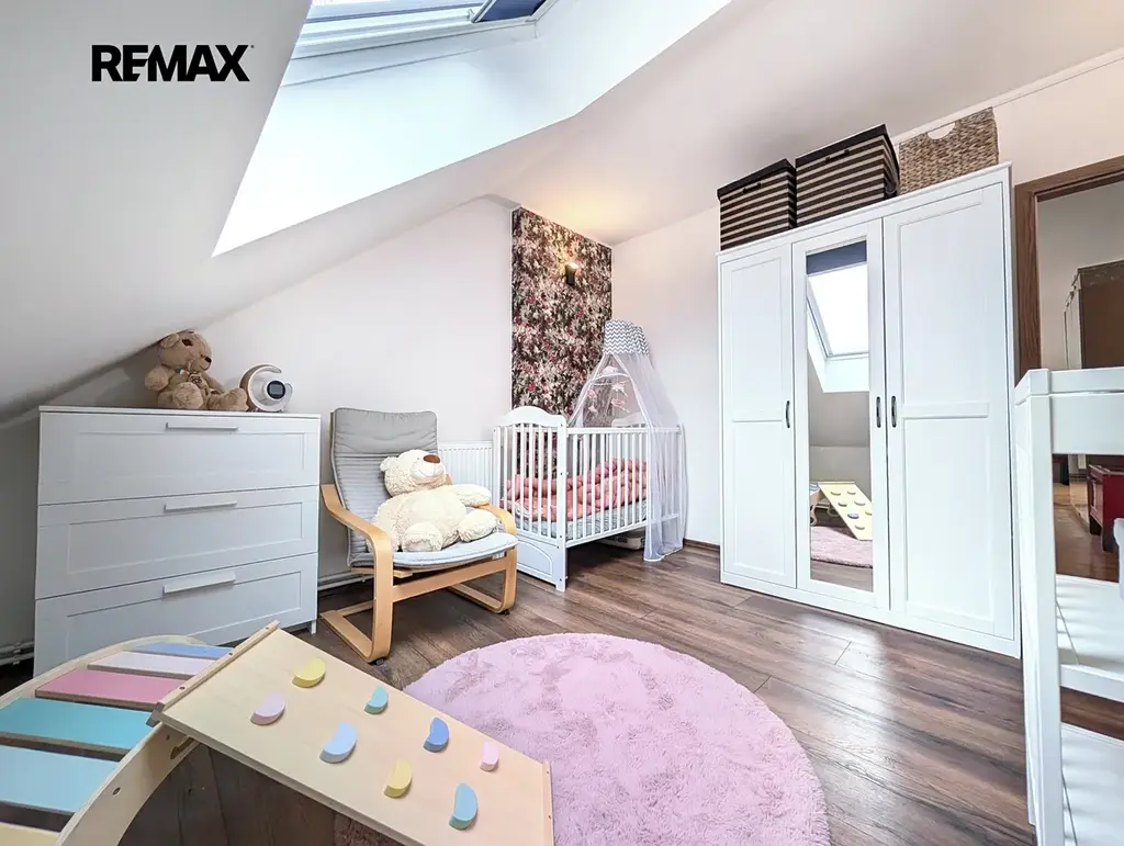 Hlavním benefitem bytu je velkorysý obývací pokoj (25 m²), který nabízí dostatek místa pro rodinné zázemí. Na něj navazuje samostatná kuchyně (10 m²) s moderní kuchyňskou linkou a vestavěnými spotřebiči. Za kuchyní se nachází praktická spíž/komora s oknem, ideální nejen pro skladování, ale i pro umístění pračky a sušičky. Byt dále disponuje dvěma samostatnými ložnicemi orientovanými na sever (11 m² a 12 m²), zatímco kuchyň a střešní okno v obývacím pokoji směřují na jih, což zajišťuje příjemné světelné podmínky během celého dne. Součástí bytu je také centrální chodba, ze které je vstup do všech místností, dále koupelna po rekonstrukci z roku 2020 s vanou a samostatná toaleta.