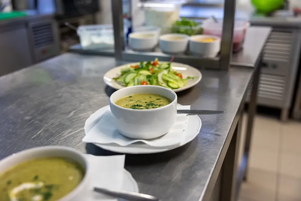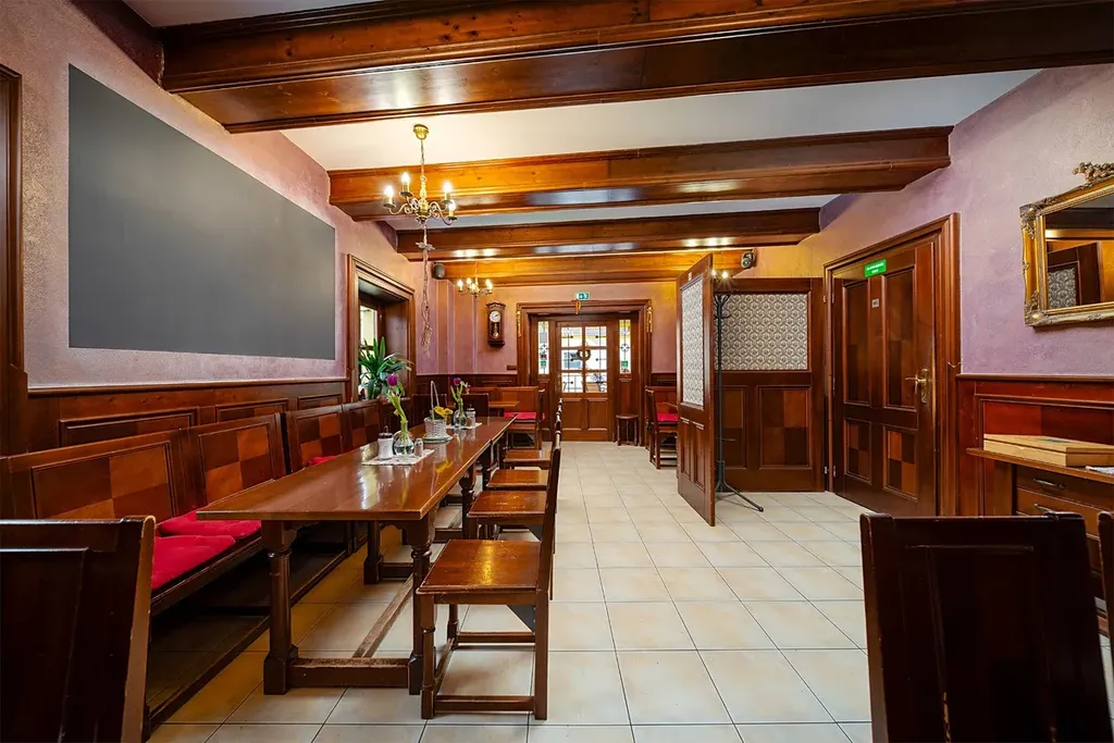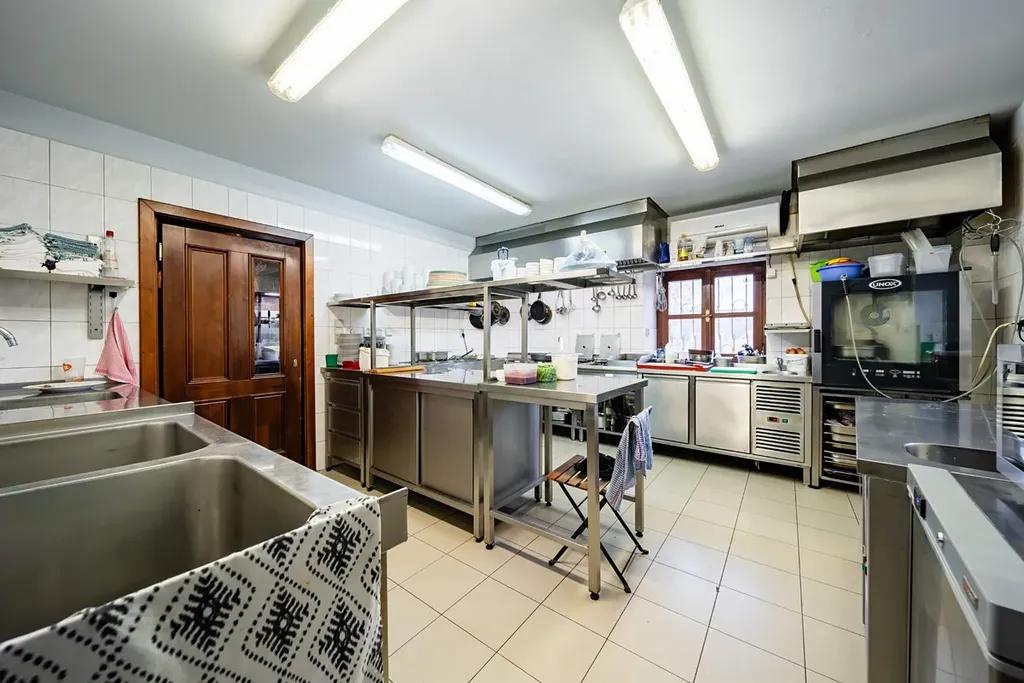 1. NP (68 m²): V přízemí se nachází restaurační část (31,5 m²) se 6 stoly, plně vybavená kuchyně (18,8 m²) a hygienické i technické zázemí (17,4 m²).