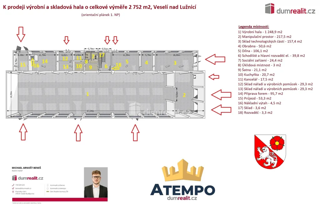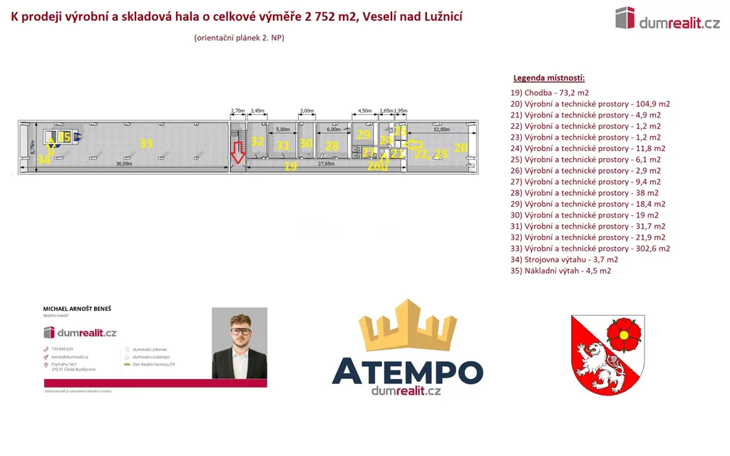 Dumrealit.cz Vám zprostředkuje prodej 100% podílu obchodní společnosti včetně výrobní a skladové haly s kancelářským a sociálním zázemím o celkové výměře podlahové plochy 2 752 m² vedené na LV č. 2985 ve Veselí nad Lužnicí. Výrobní a skladová hala se nachází na strategickém místě u sjezdu z dálnice D3 do města Veselí nad Lužnicí. Hala se vstupním příkonem 150A prošla rozsáhlou rekonstrukci s kolaudací v r. 2023. Veškerá zařízení jsou ve výborné kondici s pravidelnou revizí. Dispozici prostor naleznete na orientačním plánku mezi fotografiemi. Obchodní společnost je bez právních vad. Exkluzivní místo pro rozvoj a expanzi Vašeho podnikání. Více informací Vám poskytne realitní makléř Michael Arnošt Beneš z realitní kanceláře A TEMPO fungující pod ochranou známkou dumrealit.cz. Ev. číslo: 655984.