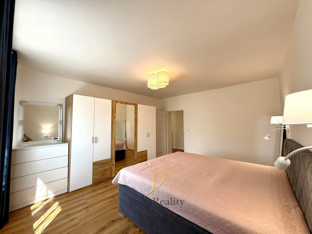 Byt o celkové výměře 86 m² vyniká svou prostorností a praktickým uspořádáním. Dispozice zahrnuje vstupní chodbu s dostatkem úložného prostoru, samostatnou toaletu a koupelnu vybavenou sprchovým koutem. Srdcem bytu je obývací pokoj, ze kterého se vstupuje do ložnice s přímým vstupem na balkon o velikosti 7 m². K dispozici je dále další samostatný pokoj a kuchyně se spižírnou. Kuchyňská linka je plně vybavena vestavěnými spotřebiči, konkrétně plynovým sporákem, myčkou nádobí a elektrickou troubou.