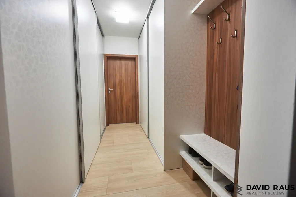 Popis dispozičního řešení: Vstupní dveře vedou do předsíně, která nabízí dostatek úložného místa díky chytře zabudované vestavěné skříni. Majitelé nezapomněli ani na věšákovou stěnu a malý botník pro rychlé odkládání věcí. Od vstupních dveří nalevo se nachází dveře do koupelny se sprchovým koutem, zvolené obklady ve světlých tónech jsou nadčasové, ve stejném designu jako na samostatném WC. Z chodby vedou dál dveře do obývacího pokoje s lodžii a do kuchyně. Z obývacího pokoje vedou dveře do ložnice. O zabudované úložné prostory není ani zde nouze a ještě je tu prostor na dětskou postýlku, který ocení novopečení rodiče, tak i prostor na samostatně stojící skříňku. V pravé části bytové jednotky je z chodby přístupný další pokoj, který může sloužit jako pracovna či dětský pokoj.