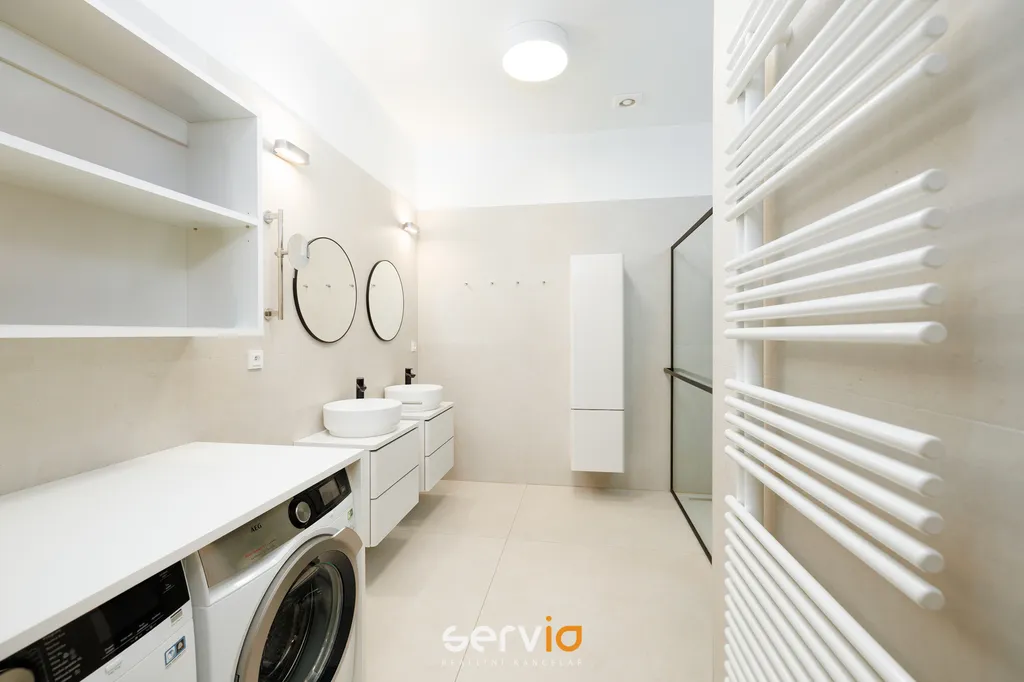 Nadstandardně vybavené prostory se nachází ve 1PP a skládájí se ze 2 neprůchozích pokojů, obývacího pokoje s kuchyní plně vybavenou spotřebiči Siemens, prostorné koupelny se sprchovým koutem, pračkou a sušičkou, samostatného WC, šatny a terasy (18 m2) se třemi samostatnými vstupy.