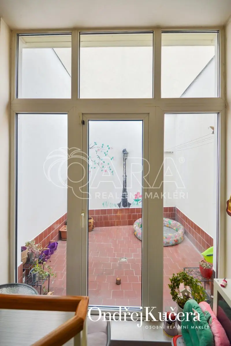 V přízemí je prostorný ateliér o rozloze 125 m², ideální pro galerii, showroom či kancelářské prostory. V prvním patře je světlý a prostorný byt 2+kk o ploše 97 m², přístupný točitým schodištěm z přízemí, což zajišťuje jedinečné propojení pracovního a soukromého prostoru. Vhodné také na investici, protože momentálně je dům obsazen dobrými nájemníky.