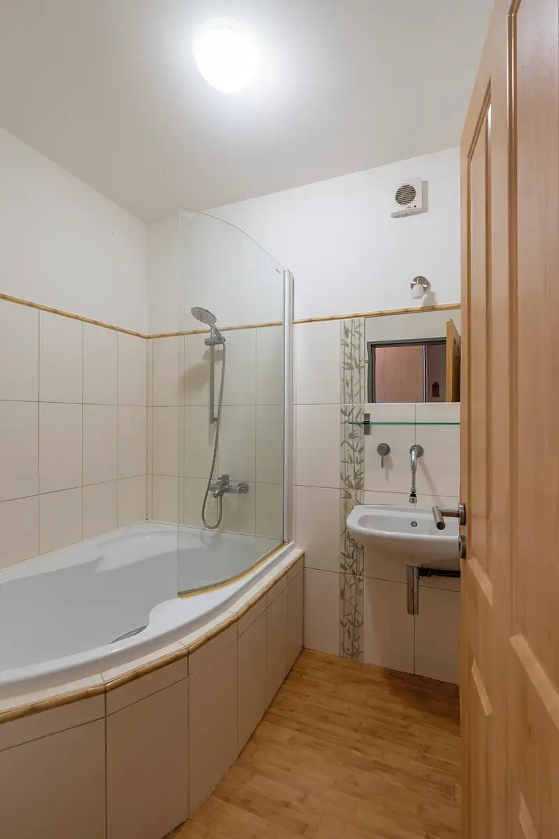 V domě se také nachází společné prostory ( kolárna nebo kočárkárna). V kuchyni je komplet vybavena kuchyňská linka. Koupelna je vybavena, vanou, umyvadlem a prostorem pro pračku. WC je samostatné.