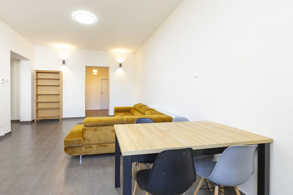 Byt se pronajímá včetně vybavené kuchyňské linky s potřebnými spotřebiči (varné desky, pečící a mikrovlnné trouby, odsavače par, myčky nádobí). Dále je k dispozici pračka, rohová rozkládací sedačka, jídelní stůl se židlemi, postel, šatní skříň.
