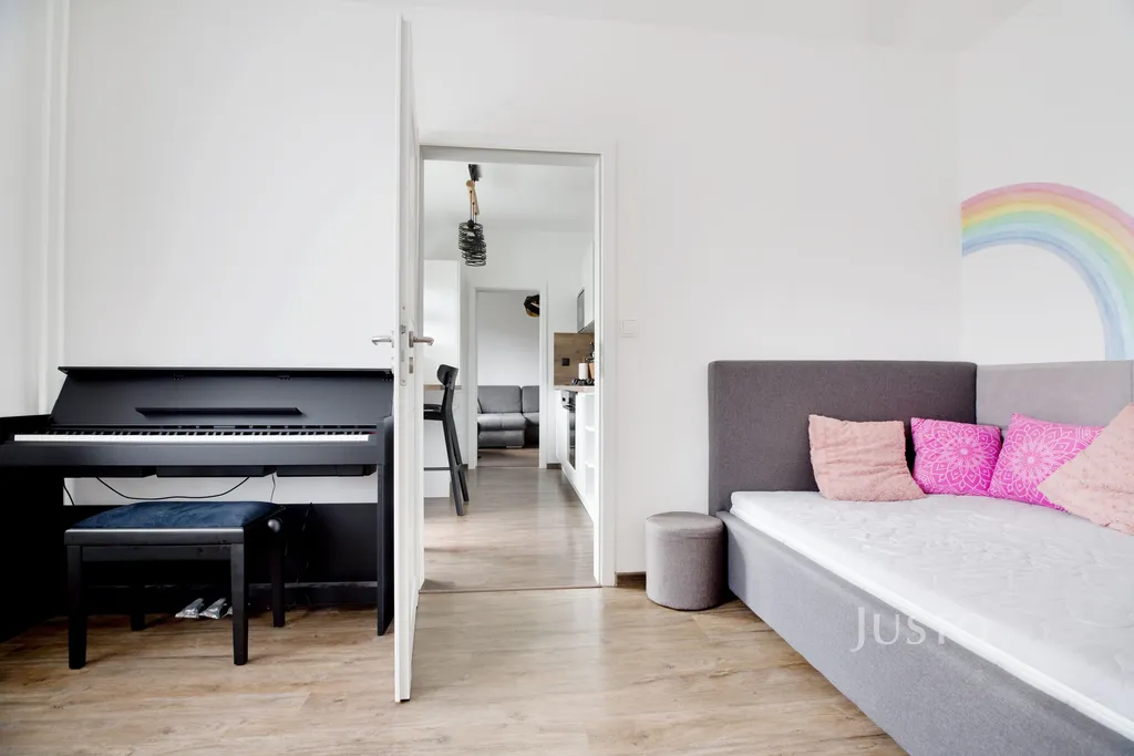 Byt dále nabízí ložnici, dětský pokoj, koupelnu s vanou, samostatnou toaletu a prostornou vstupní chodbu s dostatkem místa pro úložné řešení. Součástí bytu je také praktická komora.